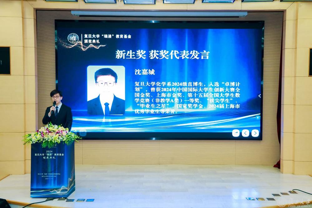 从复旦附中考入复旦大学化学系,即将在复旦开启博士生涯的化学系2024级直博生沈嘉城代表全体获奖新生发言,从高中生到一名入选“卓博计划”的博士生,从推开科学之门到获得2024中国国际大学生创新大赛全国金奖,他在复旦的培育下茁壮成长。他引用习近平总书记给中国国际大学生创新大赛参赛学生代表回信中的话“创新是人类进步的源泉,青年是创新的重要生力军”与获奖新生们共勉,作为化学、材料这样基础前沿学科的学生,作为复旦这所百年学府的学生,未来将承担起时代的重担,以自身的探索、思考、钻研来实现真正的创新,以创新来推动人类的进步!
