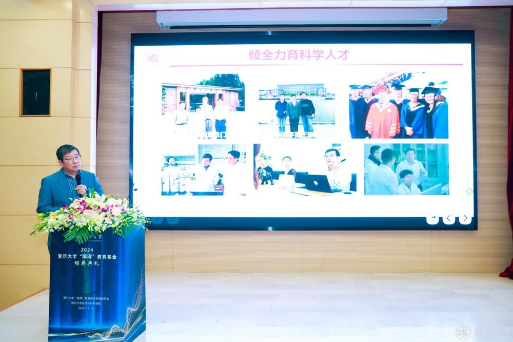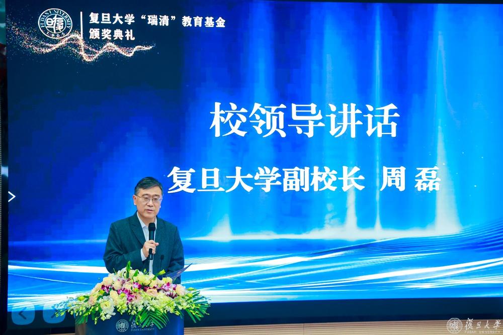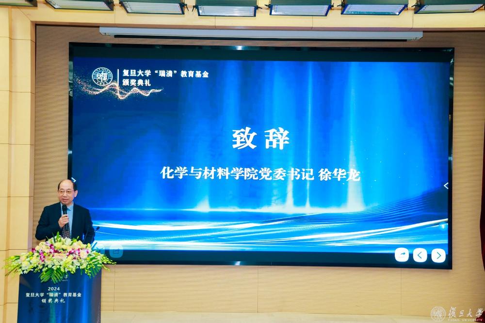 复旦大学副校长周磊向受到表彰的老师和同学们表示热烈祝贺,向谭瑞清先生及广大校友对学校发展的关心和支持表示衷心感谢。周磊表示,复旦大学化学与材料学院是学校为加快双一流建设,加强化学和材料学科的融合创新而建设的重要学科集群和研究平台,希望化材学院进一步携手“瑞清”教育基金、广大校友和社会各界,凝聚发展合力,加快融合创新,促进化学、材料科学与工程学科率先进入世界一流前列。