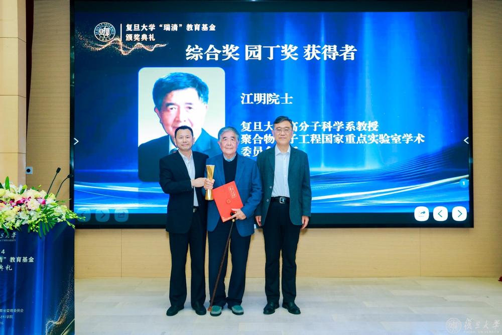 从1958年开启在复旦的教学科研生涯,辛勤耕耘六十余载的江明院士获得2024年“瑞清”教育基金综合奖——园丁奖。他开创了大分子自组装的新路线,培养了大批优秀学者,为复旦大学化学学科的发展、高分子学科的初创建设和人才培养做出了突出贡献。中国科学院院士彭慧胜宣读园丁奖颁奖词,并与周磊副校长一同为江明院士颁发园丁奖证书和奖杯。