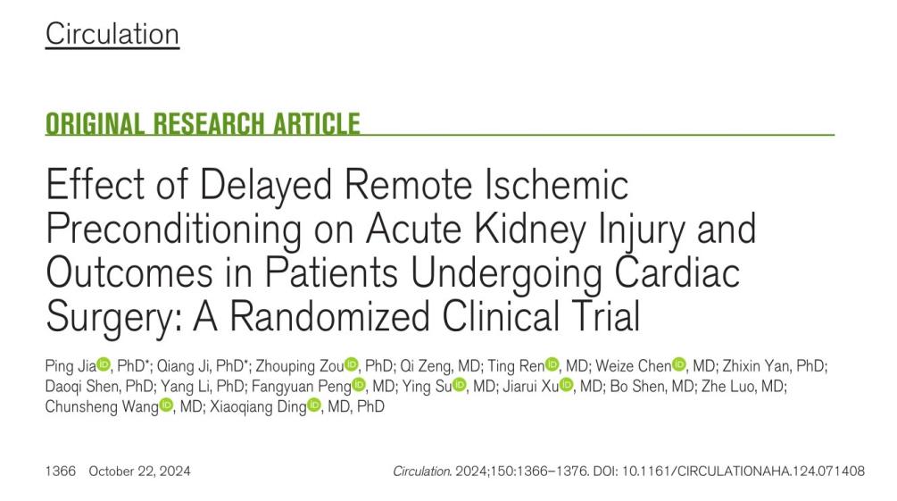 近日,复旦大学附属中山医院肾内科主任丁小强教授、贾平副教授,与心外科主任王春生教授、心脏重症监护中心主任罗哲教授合作,《循环》(Circulation)杂志上发表了题为《晚期远程缺血预适应预防心脏术后急性肾损伤的随机对照研究》(“Effect of Delayed Remote Ischemic Preconditioning on Acute Kidney Injury and Outcomes in Patients Undergoing Cardiac Surgery: A Randomized Clinical Trial”)的临床研究论文。该研究创新性地利用晚期远程缺血预适应技术,成功降低了心脏术后急性肾损伤的发病率,为心脏术后急性肾损伤的预防开辟了一条简便、经济、安全的全新路径。