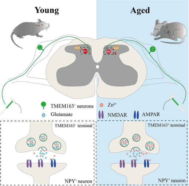 复旦大学脑科学研究院/脑功能与脑疾病全国重点实验室韩清见研究员联合南京医科大学附属无锡人民医院张昕教授,在PLOS Biology杂志上发表题为《表达转运蛋白TMEM163的背根神经节神经元中囊泡锌离子水平升高导致老年性瘙痒》(“Elevated vesicular Zn2+ in dorsal root ganglion neurons expressing the transporter TMEM163 causes age-associated itchy skin in mice”)的研究论文,揭示了锌离子转运蛋白163(Transmembrane protein 163, TMEM163)在调控慢性瘙痒的作用机制。该研究发现在背根神经节(Dorsal root ganglion,DRG)中有一群表达囊泡Zn2+转运蛋白TMEM163的神经元,该类群神经元选择性地与脊髓背角NPY+抑制性中间神经元形成单突触连接,通过释放Zn2+调节脊髓NPY+抑制性中间神经元的活动。在衰老和干皮病状态下,TMEM163的表达和储存在TMEM163+神经元末梢的囊泡Zn2+的浓度显著增加。当外界触觉刺激后,更多的Zn2+释放至突触间隙,从而抑制脊髓NPY+抑制性中间神经元的活性,使瘙痒传递神经环路去抑制,最终导致慢性瘙痒的发生。此研究将为解释干皮病或皮肤老化等病理条件下慢性瘙痒的增强、痒觉敏化和异痒敏的发生提供新的理论,同时为慢性瘙痒临床治疗提供新的思路。