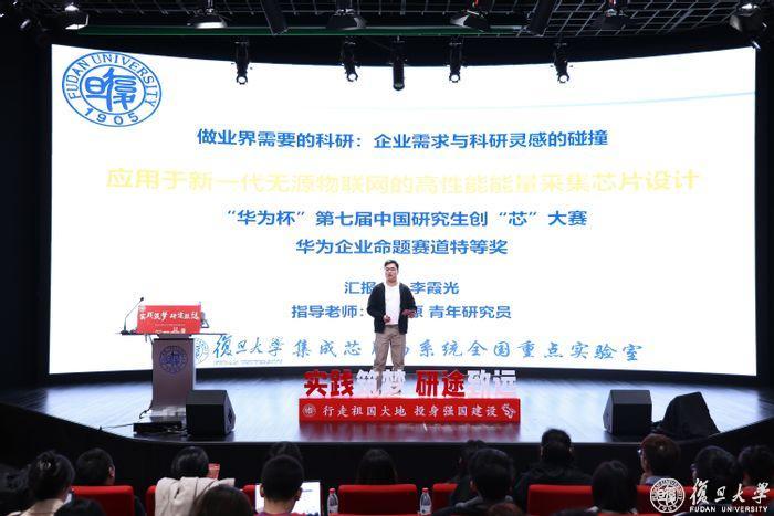 来自微电子学院博士生李霞光代表团队分享了他们在竞赛实践中的收获,聚焦企业需求与科研灵感的碰撞,坚持做业界需要的科研。在今年的八月份举办的华为杯中国研究生创“芯”大赛中,团队获得了华为企业命题赛道特等奖。