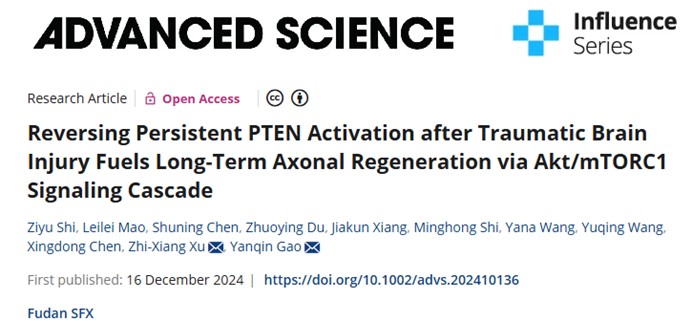 2024年12月16日,复旦大学脑科学研究院/脑功能与脑疾病重点实验室高艳琴教授团队联合许智祥研究员团队,在Advanced Science上发表题为《逆转创伤性脑损伤后的持续性PTEN激活可通过Akt/mTORC1信号级联促进长期轴突再生》(“Reversing Persistent PTEN Activation After Traumatic Brain Injury Fuels Long-Term Axonal Regeneration via Akt/mTORC1 Signaling Cascade”)研究成果。该研究发现PTEN在创伤性脑损伤(TBI)后持续激活,而神经元PTEN缺失能够持续激活Akt-mTORC1通路,促进长期的神经再生和神经回路重塑。通过这一机制,PTEN缺失有助于改善神经功能,促进轴突修复和功能恢复。