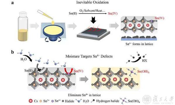 11月26日,信息科学与工程学院解凤贤研究团队联合华侨大学魏展画研究团队,提出了创新的“水汽靶向清除Sn4+缺陷”策略。通过水分选择性水解SnX4并生成Sn(OH)4,实现了对Sn2+的保护和Sn4+缺陷的有效消除,显著提升了薄膜质量和器件性能。最终,团队制备的NIR-II Pero-LEDs在945 nm的发射波长下,外量子效率达到7.61%,创造了该领域的新纪录。该研究为高效、稳定的无铅光电器件开发提供了新思路,并以“Targeted Elimination of Tetravalent-Sn-induced Defects for Enhanced Efficiency and Stability in Lead-Free NIR-Ⅱ Perovskite LEDs”为题,发表在国际著名期刊Nature Communications上。