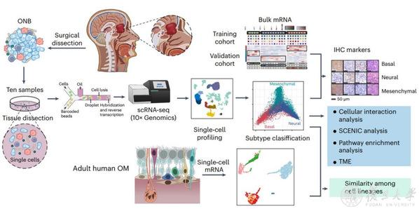 11月14日,附属眼耳鼻喉科医院余洪猛、孙希才团队在国际学术期刊《自然-癌症》(Nature Cancer),发表了题为“Single-cell transcriptomic landscape deciphers olfactory neuroblastoma subtypes and intra-tumoral heterogeneity”的研究论文,首次提出了嗅神经母细胞瘤基底型/神经型/间质型“三分型系统”及分类标准。附属眼耳鼻喉科医院鼻颅底肿瘤研究团队以高通量单细胞转录组学(scRNA-seq)为主要工具展开深入研究。依托本中心富集大量鼻颅底罕见肿瘤的临床样本优势,研究团队首次提出嗅神经母细胞瘤基底型/神经型/间质型分型系统及分类标准,并将单细胞分析结果投射到更大样本量的bulk RNA队列、临床病例队列,对发现结果进行了有效验证。本研究还揭示了嗅神经母细胞瘤肿瘤微环境互作的分子机制,并通过罕见肿瘤临床前模型的构建,对基于嗅神经母细胞瘤分子内在型的精准治疗进行了探索。