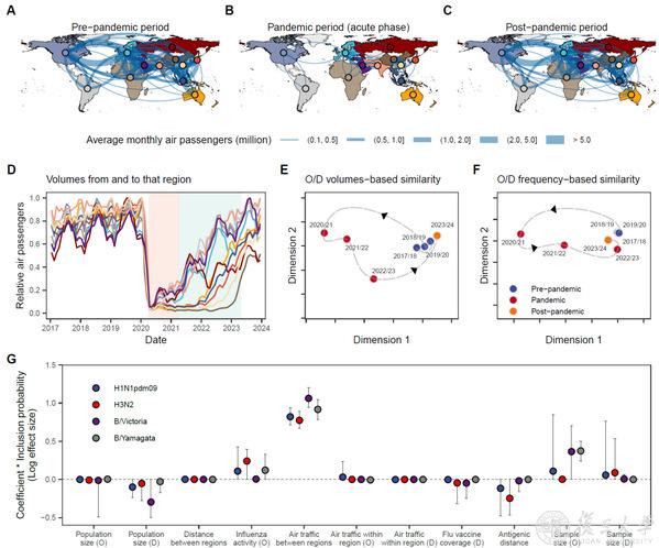 (A-C:不同时期的区域间航空流量;D:各区域相对出入航空流量;E-F:不同时期航空流量绝对值和模式分布;G:流感传播驱动因素)
