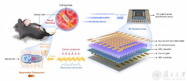 11月20日,复旦大学周鹏/王水源团队与长征医院合作,在感觉神经-机器接口方面取得了重要进展。相关成果以“Neuromorphic peripheral sensory-computer interface embodied by two-dimensional ultrasensitive circuits”为题发表于Materials Science & Engineering R: Reports期刊。研究团队提出了一种感觉神经-机器接口(Peripheral Sensory-Computer Interface, PSCI)系统,其核心采用超灵敏、低功耗、原子级超薄二维晶体管阵列。该新型接口能够以高精度捕获和解码来自感觉神经的生物电信号。通过与神经生理学的无缝集成,PSCI 实现了1个月的目标器官功能精确监测与调控,解析出与器官再生相关的0-20Hz频带及波形,进一步通过闭环电刺激实现了受损椎间盘的恢复再生。这一进展强调了二维材料在生物电子医疗技术中的应用潜力,为个性化医疗和推进神经电生理治疗策略提供了新方案。
