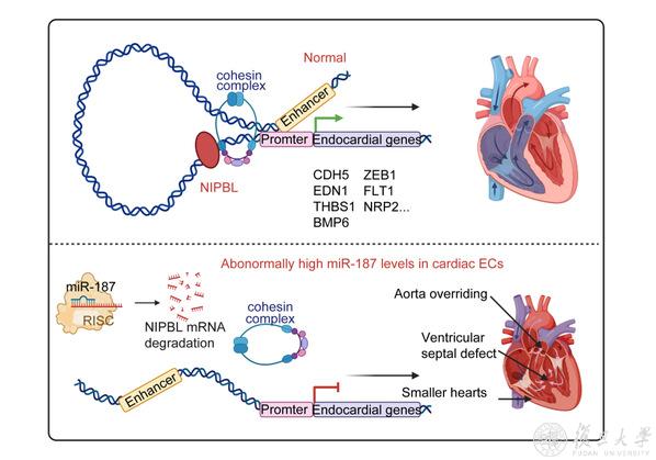 11月28日,复旦大学附属妇产科医院王红艳教授课题组联合上海交通大学医学院附属第九人民医院沈键锋教授,在国际学术期刊Journal of Clinical Investigation上发表了题为“Elevated microRNA-187 causes cardiac endothelial dysplasia to promote congenital heart disease through inhibition of NIPBL”的研究成果,揭示了心脏内皮细胞专一性高表达的miR-187在诱导先天性心脏病发生中的关键调控作用。该研究证明miR-187/NIPBL轴是心脏内皮细胞发育调控的核心因子,基于小鼠模型和人类心脏类器官的研究提示,在心脏发育的关键窗口期,即便是miRNA水平的扰动也可能引发严重的发育缺陷。这一发现为深入理解心内皮细胞的发育过程和miRNAs在器官发育中的调控机制奠定了基础。
