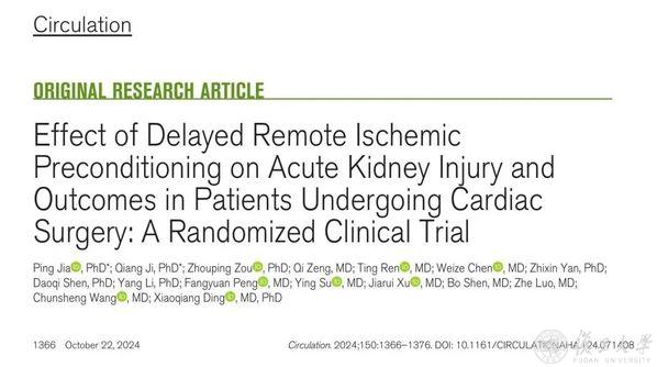 11月20日,复旦大学附属中山医院肾内科主任丁小强教授、贾平副教授,与心外科主任王春生教授、心脏重症监护中心主任罗哲教授合作,在国际权威期刊Circulation(《循环》)杂志上发表了题为“Effect of Delayed Remote Ischemic Preconditioning on Acute Kidney Injury and Outcomes in Patients Undergoing Cardiac Surgery: A Randomized Clinical Trial”的临床研究论文。该研究创新性地利用晚期远程缺血预适应技术,成功降低了心脏术后急性肾损伤的发病率,为心脏术后急性肾损伤的预防开辟了一条简便、经济、安全的全新路径。
