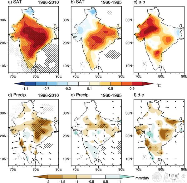 1986–2010和1960–1985年间厄尔尼诺次年6月南亚地区的气温和降水异常以及两个时期的差异