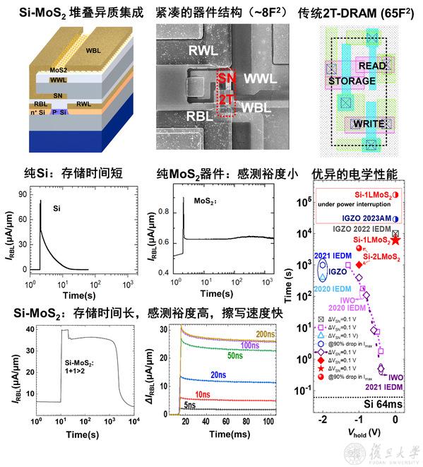 2.信息科学与工程学院万景研究员、微电子学院包文中研究员及周鹏教授联合提出一种结合硅基与二维材料的异质集成嵌入式2T-eDRAM结构