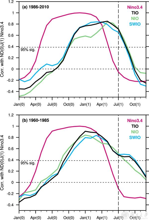1986–2010和1960–1985年间厄尔尼诺(红线)以及相关联的热带印度洋(黑线)、北印度洋(绿线)、西南印度洋(蓝线)海温演变特征