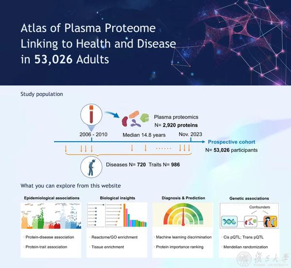 11月22日,复旦大学附属华山医院郁金泰教授联合类脑研究院程炜团队在生命科学期刊Cell上发表了标题为“Atlas of the plasma proteome in health and disease in 53,026 adults”的文章。在这项研究中,研究者绘制了一幅健康与疾病蛋白质图谱,涵盖了2,920种血浆蛋白质与406种既往患病、660种随访新发疾病以及986种健康相关表型,揭示了168,100个蛋白质-疾病关联和554,488个蛋白质-表型关联。该文章试图构建迄今为止最全面的蛋白质组与人类健康与疾病的图谱,并结合人工智能算法构建疾病诊断预测模型,探究药物治疗新靶点。