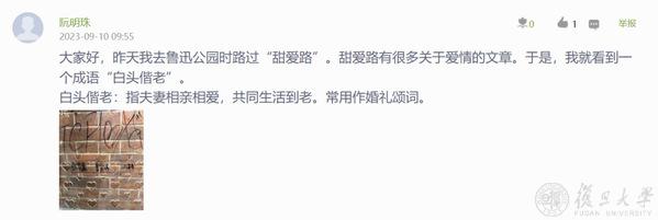 同时,老师们还注重培养学生自主学习的意识,采用“线上+线下”相结合的混合教学模式,以此实现“1+1>2”的协同增效。在“随时随地,遇见成语,记录成语”的超星课堂讨论区,学生们将在吃饭时、散步时、旅游时发现的成语以图文形式分享上来。来自越南的文化班学生阮明珠便在讨论区分享自己漫步甜爱路时遇见的成语——白头偕老,真正做到将学习融入日常生活,发现成语之美。