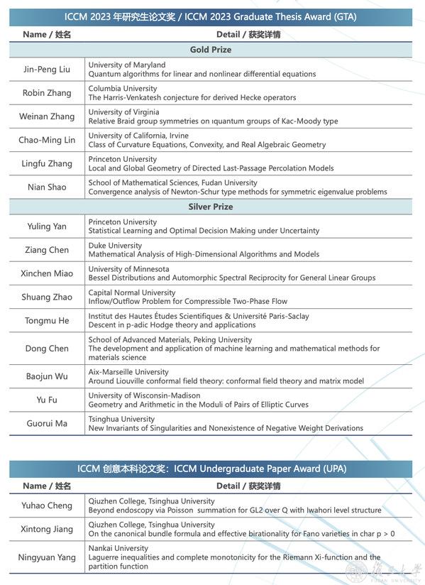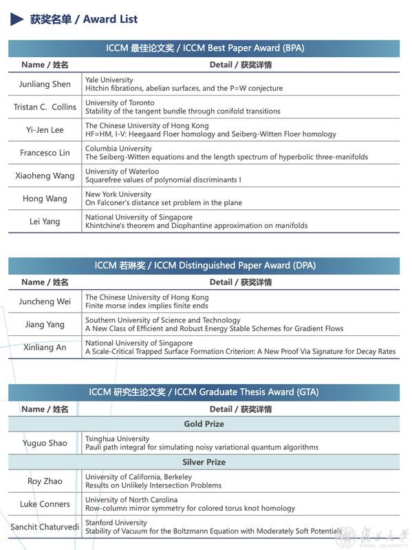 上海市副市长刘多,首位华人菲尔兹奖得主、上海数学与交叉学科研究院理事长丘成桐,中国科学院院士、复旦大学党委常委、副校长马余刚致辞。现场揭晓了最佳论文奖、若琳奖、创意本科论文奖、研究生论文奖。(详见文末全名单)