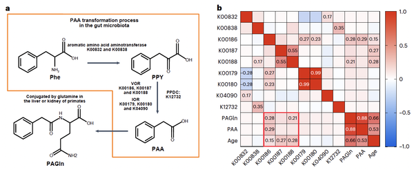 在灵长类动物中,肠道菌群可以将食物来源的 L-苯丙氨酸 (L-Phe) 转化为苯乙酸,后者被吸收进入血液循环后在肝脏或肾脏中与谷氨酰胺结合形成PAGln。研究团队发现,在衰老过程中血浆 PAA 和 PAGln 与肠道微生物特征之间发生协同变化,并且进一步的实验表明老年个体的肠道菌群携带更多的PAA生成基因,并具有更强的PAA产生能力。