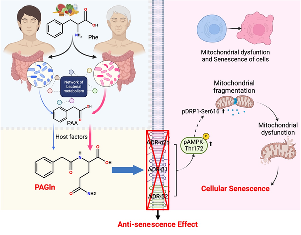2025年1月10日,复旦大学基础医学院病原生物学系、医学分子病毒学教育部/卫健委/医科院重点实验室赵超与生理与病理生理学系孙宁团队合作在Nature Aging杂志在线发表题为“Gut microbial-derived phenylacetylglutamine accelerates host cellular senescence”的文章。该研究通过分析22岁到104岁健康个体的样本,发现肠道菌群来源代谢物苯乙酸(PAA)及次级代谢物苯乙酰谷氨酰胺(phenylacetylglutamine,PAGln)在宿主血浆中随着年龄的增长而增加。机制上,PAGln通过肾上腺素受体-AMPK信号轴影响线粒体动力学紊乱,促进细胞衰老。此外,PAGln诱导的体内外细胞衰老可以通过肾上腺素能受体阻断和体内衰老细胞裂解法治疗来改善。
