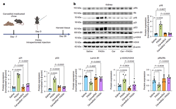 为了探索PAGln诱导细胞衰老的机制,研究团队利用RNA测序和生物分析技术,结合其他多种实验手段,发现PAGln可以通过肾上腺素能受体–AMPK信号通路诱导线粒体动力学和功能障碍,进一步增加细胞内ROS水平,介导DNA损伤。为论证在体肾上腺素能受体阻滞在拮抗PAGln诱导衰老的可能性,研究团队测试了低剂量卡维地洛(一种临床一线使用的兼具β/α-1肾上腺素受体的阻滞剂)对 PAGln诱导的衰老的改善能力。结果发现,PAGln诱导的体内外细胞衰老标志物的增加可被卡维地洛的干预所拮抗。此外,已知抗衰老药物ABT263(一种Bcl-2抑制剂)也可以显著降低PAGln所诱导的衰老表型。