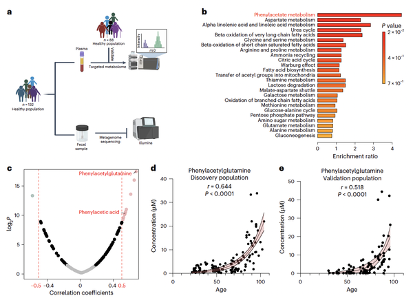 为了表征人体健康衰老过程的代谢特征,研究团队对健康人群(132 名年龄在 22 岁至 104 岁之间的健康个体)的样本进行代谢组检测。通过相关性分析发现,苯乙酸代谢途径是最显著富集的代谢途径。该代谢途径中的菌群-宿主共代谢物PAGln与年龄呈现出最强的正相关性。研究团队进一步招募独立健康验证队列,并参考其他组学结果,综合发现在健康人群中,PAGln 会普适性地随着年龄的增长而增加。