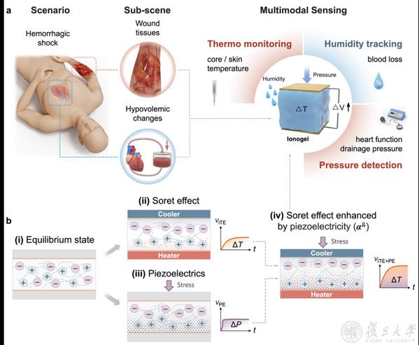 12月16日,材料科学系梁子骐教授团队联合长征医院骨科徐辰副教授以及上海硅酸盐所柏胜强研究员和陈立东院士在Advanced Materials上发表了题为“Piezoelectric-Augmented Thermoelectric Ionogels for Self-Powered Multimodal Medical Sensors”的研究论文。该论文首次探讨了材料压电和离子热电性能的叠加作用,提出并验证了“压电增强离子热电”的创新概念。基于这种对双参数高度敏感的特性,研究团队成功开发了一种嵌入式、自供电、多模态感知的凝胶传感器可应用于多个场景,分别搭载于动脉导管和医用负压吸引海绵中,实现了临床诊疗中对温度、压力和湿度的同步精确检测。基于材料的温度–压力双参数灵敏特性,团队设计了两种分别以动脉导管和医用海绵为载体的离子凝胶传感器。通过建立猪出血性休克模型,全面验证了离子凝胶传感器在实际生物体疾病发生过程中的多指标监测可行性。与传统传感器相比,离子凝胶传感器不仅趋势一致,且由于信号点更为密集,能呈现更多细节变化。这些成果展示了该技术在临床领域的巨大潜力,尤其适用于当前缺乏相关精密压力、湿度、温度监测手段如VSD应用中,具有非常重要的临床价值与传感器应用的划时代的意义。
