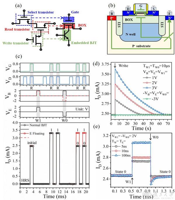 (a)BIS-DRAM单晶体管实现3T-DRAM功能;(b) BIS-DRAM的器件示意图,(c) 实验数据展示低读串扰和非破坏性读取能力,(d)室温下器件的存储特性,(e) 器件的高速擦写能力。