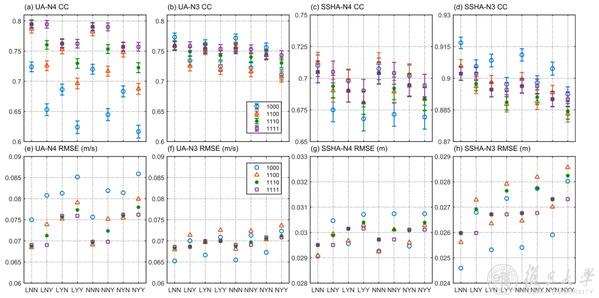 不同试验成员模拟的Niño 4区(N4),Niño 3区(N3)平均的海表纬向流场距平(UA)和海表高度距平(SSHA)与观测的相关系数和均方根误差。