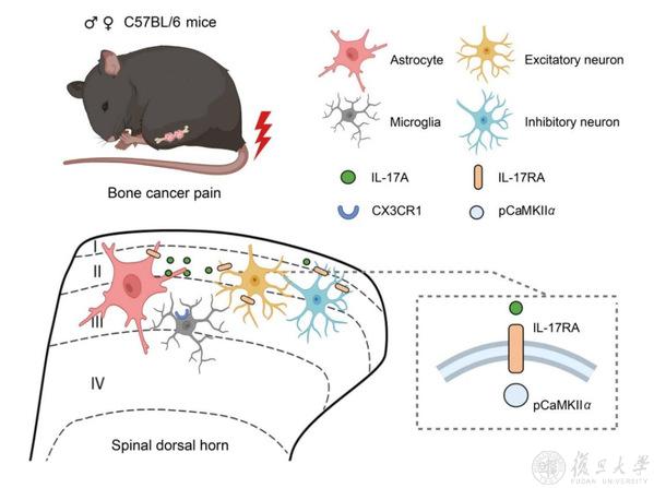 4.脑科学研究院/脑功能与脑疾病全国重点实验室张玉秋教授团队合作揭示中枢来源的IL-17A介导星形胶质细胞与神经元的相互作用促进骨癌痛的机制