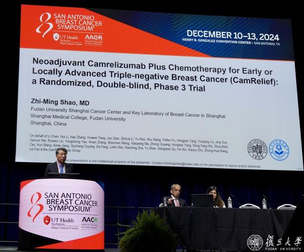 在2024年圣安东尼奥乳腺癌会议上,邵志敏教授团队发布改变三阴性乳腺癌新辅助治疗模式的临床III期关键研究成果,成为大会关注热点。《美国医学会杂志》(JAMA)也以“Camrelizumab vs Placebo in Combination With Chemotherapy as Neoadjuvant Treatment in Patients With Early or Locally Advanced Triple-Negative Breast Cancer”为题同期发表了该研究。这也是JAMA创刊141年以来,首次发表基于中国人群的乳腺癌原创新药研究,为三阴性乳腺癌的新辅助免疫治疗“中国方案”提供有力证据。