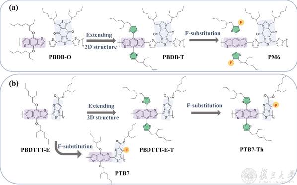 材料结构设计策略及材料化学结构。a) PM6系列材料,包括PBDB-O,PBDB-T和PM6。b) PTB7-Th系列材料,包括PBDTTT-E,PBDTTT-E-T,PTB7和PTB7-Th。