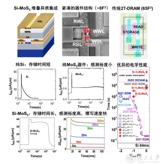 12月10日,信息科学与工程学院万景研究员与微电子学院包文中研究员及周鹏教授团队,联合提出了一种结合硅基与二维材料的异质集成嵌入式2T-eDRAM结构。该器件结合二硫化钼(MoS2)晶体管低漏电和硅晶体管高开态电流的优点实现了紧凑的单元面积(最小至8F2),极长存储时间(最高至6000s)以及高速擦写(最高至5ns)性能。相比现有SRAM技术,集成密度提升超过10倍,而存储时长比传统DRAM提升1000 倍以上。此外,该技术采用硅基后道兼容的工艺将二硫化钼与硅芯片共集成,与当前的CMOS逻辑工艺完全兼容。该项创新技术不仅在性能上显著领先,且在产业化应用方面具有重要潜力。作为目前存储密度、存储时间和制造工艺三者之间最佳平衡的一种新型存储解决方案。该项工作以“High performance Si-MoS2 heterogeneous embedded DRAM”为题发表于Nature Communications 且申请新型发明专利 (基于异质集成的叠层2T1C-DRAM存储器件及其制备方法 ;双晶体管无电容结构动态存储器件及其制备方法) 。
