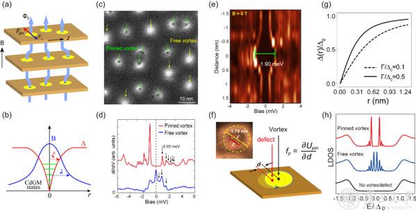 磁通钉扎的微观机理(a)层状超导体磁通钉扎示意图。(b)单磁通涡旋附近的磁场、能隙和束缚态分布。(c) 11T磁场下FeSe超导层磁通成像,绿色箭头指向被钉扎磁通,黄色箭头指未钉扎的“自由”磁通。(d)钉扎和自由磁通中心的隧道谱对比。(e)跨越钉扎磁通中心的隧道谱。(f)钉扎磁通偏移导致钉扎能变化,可导出钉扎力。(g)模型计算得到钉扎磁通中局域序参量增强。(h)钉扎磁通中束缚态的移动。