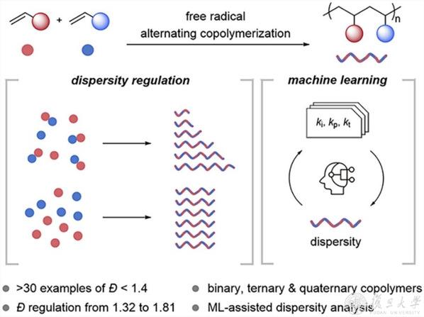12月25日,高分子科学系陈茂教授团队(PolyMao)将蒙特卡洛动力学模拟与机器学习贝叶斯优化相结合,绘制了传统自由基共聚反应的分子量分布谱图,意外发现交替共聚反应具有产生低分散共聚物的显著趋势(MWD<1.5)。陈茂团队的机器学习方案主动避免了CTC干预,发现了不同寻常的MWD趋势,揭示了在传统交替共聚中有望通过影响CTC调控MWD,首次提出了“低CTC”获得窄MWD、“高CTC”获得宽MWD的假设。以此为基础,研究团队合成了超过30种不同化学结构的交替共聚物(MWD<1.4),实现了二元、三元、四元交替共聚反应,制备了十克级的共聚产物。该工作揭示了传统自由基交替共聚中影响分子量分布的新规律,为调控MWD提供了新途径,本文建立的机器学习-蒙特卡洛模拟框架有望为不同聚合反应研究提供新思路。该工作以“Low-Dispersity Polymers via Free Radical Alternating Copolymerization: Effects of Charge-Transfer-Complexes”为题发表在《德国应用化学》(Angew. Chem. Int. Ed.2024)。