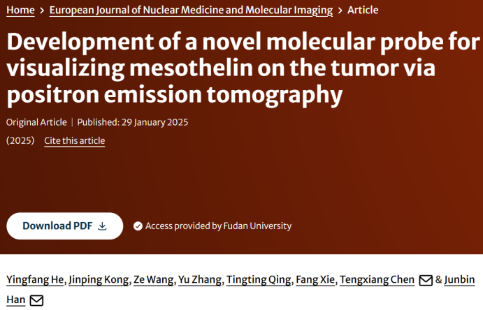 2025年1月29日,复旦大学放射医学研究所韩俊斌青年研究员和贵州医科大学陈腾祥教授在核医学期刊European Journal of Nuclear Medicine and Molecular Imaging上发表文章题为“Development of a novel molecular probe for visualizing mesothelin on the tumor via positron emission tomography”的研究论文。该研究全新开发了一种以纳米抗体为载体的MSLN靶向放射性探针,在卵巢癌CDX和胰腺癌PDX模型中表现出良好的显像效果。