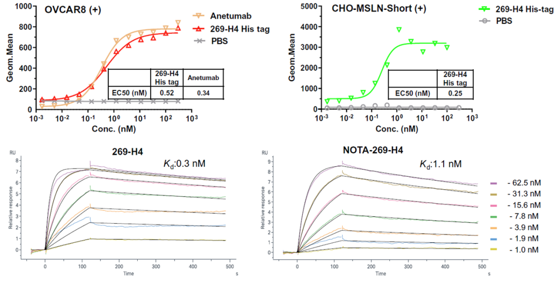 研究团队为避免纳米抗体探针与内源性CA125发生竞争结合,特意使用从残基360到残基597的MSLN片段对羊驼进行免疫,所得的纳米抗体性显示出与MSLN靶点极高的亲和力(0.3 nM)。随后抗体经偶联和68Ga放射标记后依旧对靶点保持了纳摩级的结合力。在影像学实验中,探针在MSLN高表达卵巢癌OVCAR-8和低表达SKOV-3模型中表现出明显的差异,摄入与靶点表达呈现正相关。作为潜在临床转化的初步验证步骤,在携带经证实高表达MSLN的胰腺癌患者来源异种移植物(PDX)的小鼠模型中,[68Ga]Ga-NOTA-269-H4表现出更为清晰的影像效果,为后续进一步开展临床研究打下了良好的基础。