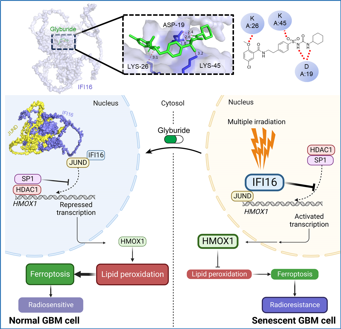 该研究还突破性地提出老药新用策略,发现经典降糖药Glyburide可特异性结合IFI16的pyrin结构域,破坏其与转录因子JUND和SP1的相互作用,抑制HMOX1转录,从而干扰细胞衰老样表型产生,增强肿瘤辐照后的铁死亡水平,增加胶质瘤辐射敏感性。