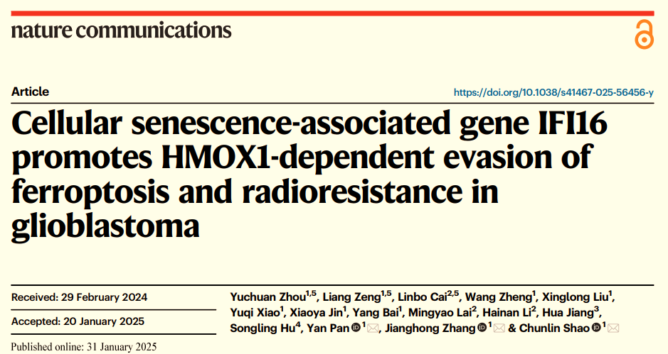 2025年1月31日,《自然-通讯》(Nature Communications)(2025, 16:1212)杂志在线发表了复旦大学放射医学研究所邵春林团队题为“Cellular senescence-associated gene IFI16 promotes HMOX1-dependent evasion of ferroptosis and radioresistance in glioblastoma”的研究成果。该研究首次阐明细胞衰老相关基因IFI16介导的铁死亡逃逸机制在胶质瘤辐射抵抗中的关键作用,并创新性发现经典降糖药物格列本脲(Glyburide)可通过靶向调控该通路显著提升辐射敏感性,为胶质瘤治疗提供了全新策略。