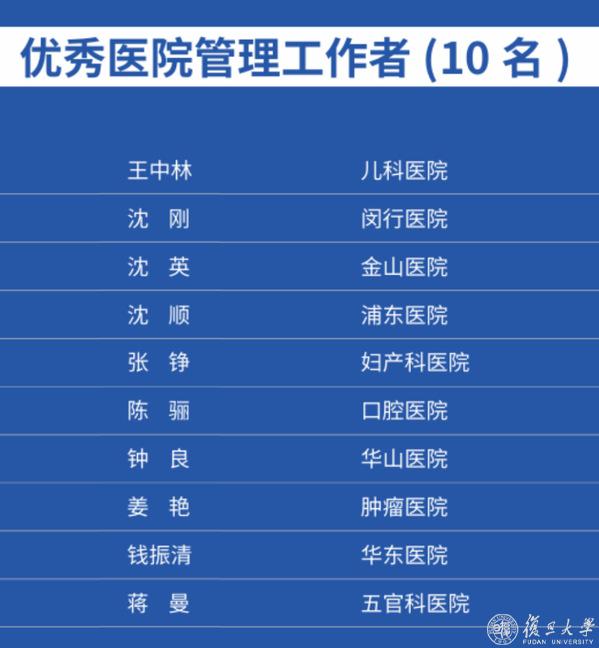 为大力弘扬医务工作者敬佑生命、救死扶伤、甘于奉献、大爱无疆的崇高职业精神,自2017年起,学校每年度组织开展复旦大学“十佳百优”(医务)评选活动,遴选复旦大学“十佳医务工作者”、“优秀医生”、“优秀青年医生”、“优秀护士”、“优秀医技工作者”、“优秀医院管理工作者”、“优秀医院后勤工作者”、“优秀医疗援建工作者”、“优秀医疗团队”、以及“优秀医疗服务品牌”。日前,复旦大学“十佳百优”(医务)获奖名单公布,共有92名医务工作者、10个医疗团队、10个医疗服务品牌获奖。