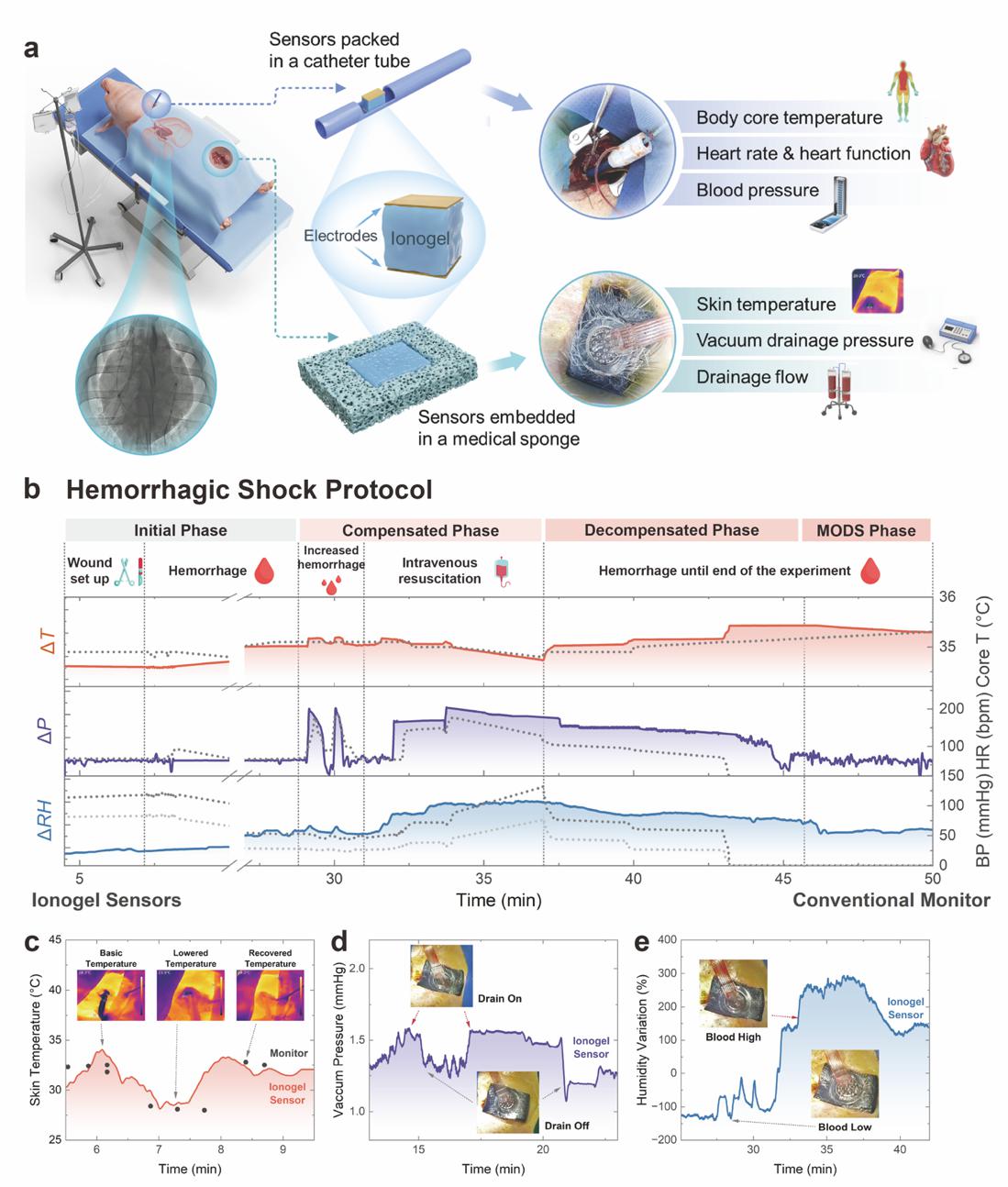 基于材料的温度–压力双参数灵敏特性,团队设计了两种分别以动脉导管和医用海绵为载体的离子凝胶传感器。器件结构简单:将离子凝胶夹在两片电极之间并连接导线,嵌入动脉导管或医用海绵的开孔,再用硅胶填充缝隙。通过建立猪出血性休克模型,全面验证了离子凝胶传感器在实际生物体疾病发生过程中的多指标监测可行性。其中动脉导管传感器的温度和压力信号能准确反映休克过程中的核心体温变化和心率波动;海绵传感器则捕捉创口温度、负压吸引装置(VSD)的压力以及瞬时引流量等关键指标。
