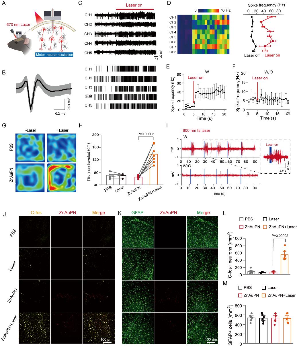 值得一提的是,当部分ZnP被AuP+取代时,结果显示双光子吸收截面增加了一倍,达到4369GM,极大增强了对深部脑区的调控能力。研究人员将电极注入小鼠运动皮层,在可见光单光子和近红外双光子激发下,通过颅外调控实现了神经元放电频率的提高,显著增强了小鼠的运动能力。