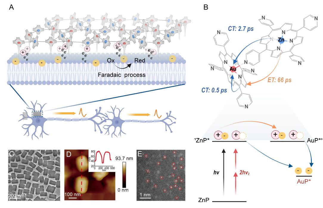 受光合细菌光能转换机理的启发,研究人员采用离子交换新策略,将ZnTPyP中的部分锌离子替换为金单原子,构建了p-n双分子金属卟啉体异质结(ZnAuPN)。利用瞬态吸收光谱,系统揭示了ZnAuPN的独特电荷转移机制。该结构展现出超快的分子间能量转移速率(~ 66 ps)和分子内电荷转移速率(~ 0.5 ps),实现了高达97%的光诱导电荷分离和传递效率,最终将电子有效传递至金卟啉的金原子中心,形成富电子的单原子金电极阵列。这些高活性的金原子可通过法拉第机制将电荷高效注入神经组织,实现了单个神经元的高时空分辨率调控。在激光照射下,单个神经元的电荷注入高达~4 pC,实现了亚毫秒时间分辨率动作电位的激发。进一步,通过突触前单细胞的刺激,成功诱发出突触后电流,实现了神经微环路的调控。