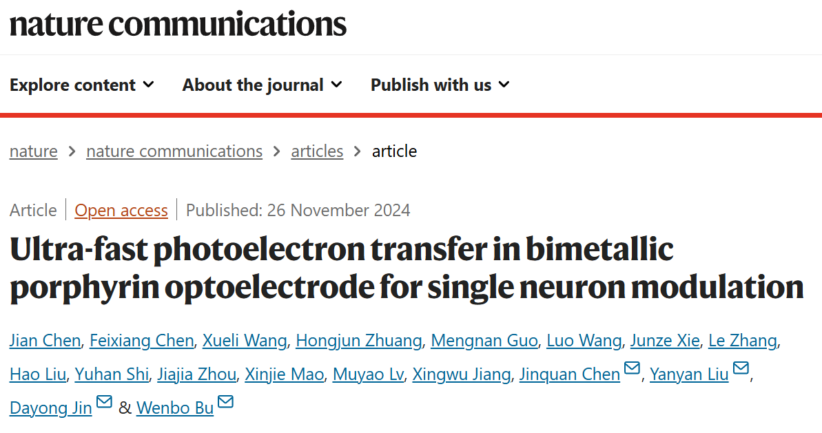 近日,复旦大学材料科学系/聚合物分子工程国家重点实验室步文博教授、刘艳颜青年研究员联合悉尼科技大学/宁波东方理工大学金大勇院士、华东师范大学陈缙泉教授,在Nature Communications期刊发表了题为“Ultra-fast photoelectron transfer in bimetallic porphyrin optoelectrode for single neuron modulation”的研究论文。研究团队设计并制备了一类可响应近红外光的新型p-n双分子异质卟啉纳米光电极,具备超快的分子间能量转移速率(~66 ps)和分子间电荷转移速率(~0.5 ps),光诱导电荷分离和传递效率高达97%,实现了超快的单个神经元的高时空分辨率调控。