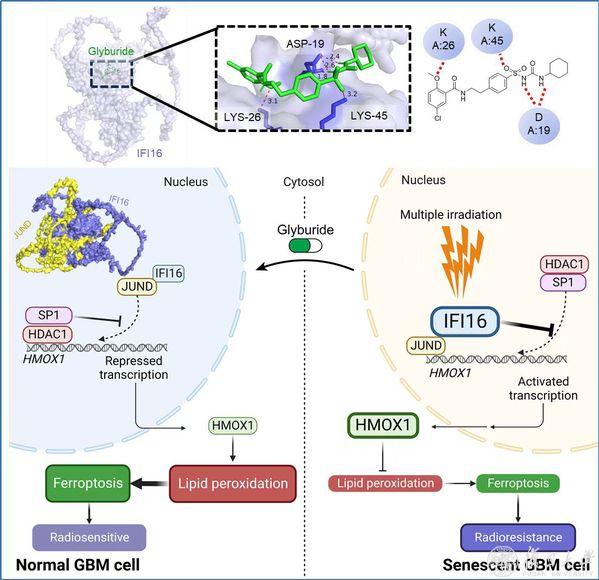 团队通过构建辐射抵抗胶质瘤细胞模型,发现IFI16引起的细胞衰老样表型(Cellular senescence-like phenotype)是导致辐射抵抗的一个关键诱因。细胞衰老相关蛋白IFI16通过与转录因子JUND和SP1相互作用,可激活铁死亡调控因子HMOX1转录,显著降低细胞内脂质过氧化、活性氧及亚铁离子水平,抑制辐射诱导的铁死亡(Ferroptosis)发生,最终导致肿瘤细胞的辐射抵抗。该研究还突破性地提出老药新用策略,发现经典降糖药Glyburide可特异性结合IFI16的pyrin结构域,破坏其与转录因子JUND和SP1的相互作用,抑制HMOX1转录,从而干扰细胞衰老样表型产生,增强肿瘤辐照后的铁死亡水平,增加胶质瘤辐射敏感性。研究首次构建了以IFI16为核心的“细胞衰老-铁死亡逃逸”的分子调控网络,并针对性的发现了新型胶质瘤辐射增敏药物,为胶质瘤辐射抵抗形成机制提供了全新理论框架,有望成为基础研究向临床转化的重要桥梁。
