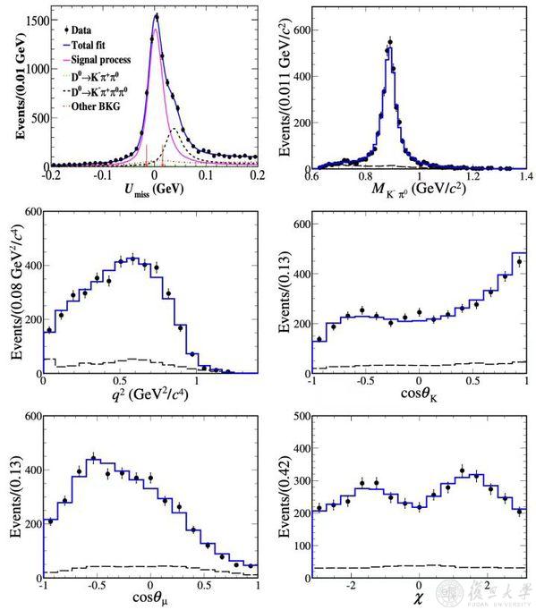 实验中观测到的D0→K*(892)−μ+νμ候选事例对应的拟合图,以及对应的振幅分析中五个动力学变量的投影分布图。带误差棒的点表示数据,蓝色线表示拟合结果,虚线表示本底的贡献