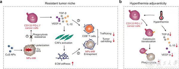 研究团队以NPs-MΦ过继治疗黑色素瘤为例,发现小鼠黑色素瘤中存在一个肿瘤细胞亚群,表现为CD133+PD-L1+表型。CD133+PD-L1+肿瘤细胞通过激活转化生长因子-β(TGF-β)通路,活化肿瘤相关成纤维细胞(CAFs),促使细胞外基质硬化,从而限制了NPs-MΦ和效应CD8+T细胞进入肿瘤组织对肿瘤细胞的攻击,同时通过分泌免疫抑制因子,如TGF-β,血管内皮生长因子-α(VEGF-α)和白介素-10(IL-10),抑制了NPs-MΦ和效应CD8+T细胞的肿瘤细胞杀伤作用。基于以上耐药机制,研究团队探索了多种联合疗法的可行性,以期逆转过继巨噬细胞疗法的耐药性。其中,辅助热疗通过增强钙网蛋白(CALR)的“吃我”信号,有效地逆转了CD133+PD-L1+肿瘤细胞对过继巨噬细胞的抗性,显著提高了过继巨噬细胞治疗的疗效。