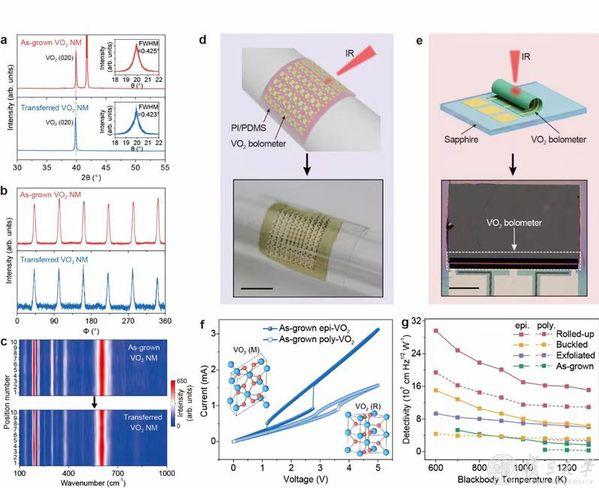 a.外延VO2薄膜剥离前后XRD图谱,插图为对应的摇摆曲线测试。b.外延VO2薄膜剥离前后XRD φ扫描图谱。c.外延VO2薄膜剥离前后线扫描Raman光谱。d.外延VO2薄膜的柔性红外探测器。比例尺为1cm。e.基于卷曲外延VO2薄膜的红外探测器。比例尺为200 μm。f.多晶VO2薄膜和外延VO2薄膜的I-V曲线。g.不同种类红外探测器的探测率(D*)对比