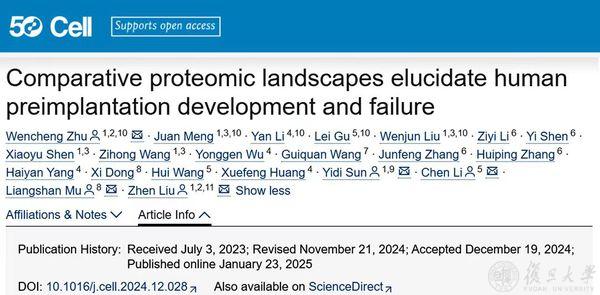1月23日,复旦大学附属中山医院生殖医学中心木良善团队与中国科学院脑智卓越中心/上海脑科学与类脑研究中心刘真、孙怡迪、朱文成及上海交通大学医学院李辰合作,于国际期刊Cell发表题为“Comparative proteomic landscapes elucidate human preimplantation development and failure”的论文。