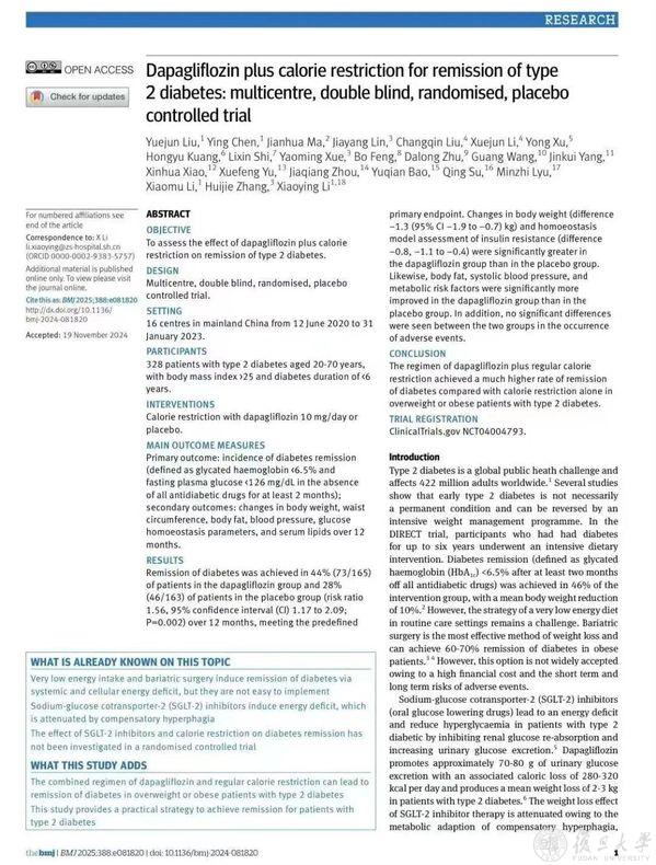 1月22日,复旦大学附属中山医院内分泌科李小英、李晓牧教授团队联合南方医科大学南方医院张惠杰教授团队在国际学术期刊《英国医学杂志》(The British Medical Journal)上发表一项重要研究成果——“Dapagliflozin plus calorie restriction for remission of type 2 diabetes: multicentre, double blind, randomised, placebo controlled trial”揭示了上述研究结论。
