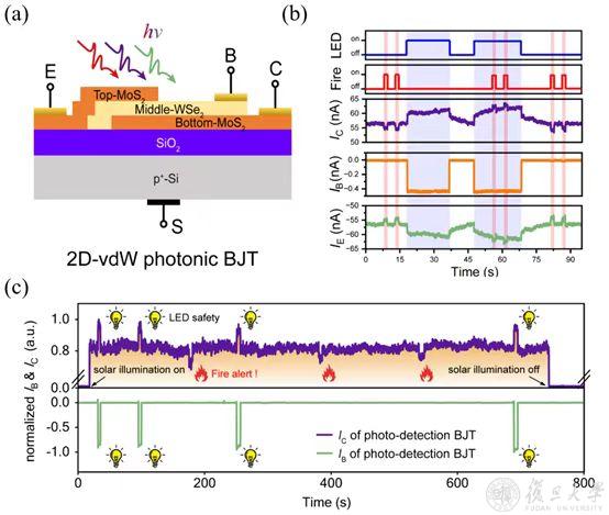 二维范德华光电子双极型晶体管(2D-vdW photonic BJT)设计及集成应用演示。(a) 2D-vdW photonic BJT原理图;(b)在有LED干扰的环境中的火灾警报测试;(c)二维光子传感芯片LED光干扰环境下全天火灾报警应用演示。