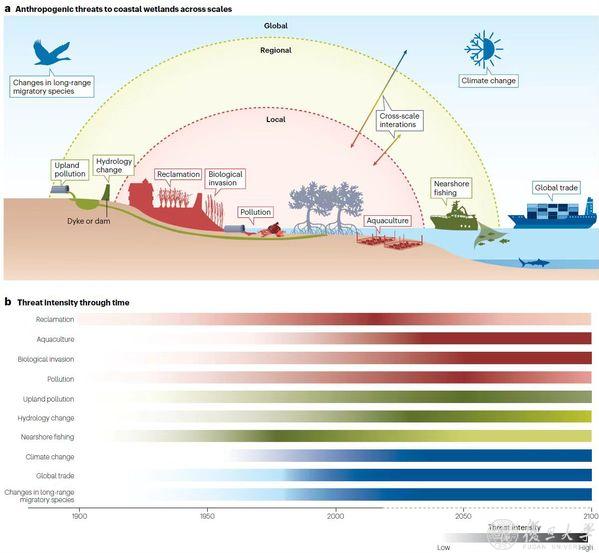 全球现有约354,600–355,120 km2的滨海湿地(盐沼、红树林和潮滩)生物多样性受胁程度高,在世界自然保护联盟红色名录收录的1589种滨海湿地动植物中,17%为濒危和近危物种,濒危/近危哺乳类和软骨鱼类动物更高达71%和83%。通过整合分析不同空间尺度上滨海湿地人为胁迫的变化趋势,研究提出,虽然近年来随着保护力度的强化,围垦、捕捞等一些局域尺度人为胁迫在部分国家或区域已开始减弱,但养殖、生物入侵、气候变化等人为胁迫,特别是区域尺度和全球尺度上的人为胁迫,预期在未来仍将持续加剧。这些区域和全球尺度的人为胁迫虽在短期内常不会直接导致滨海湿地的大幅丧失,但可通过影响生物多样性等而降低滨海湿地的质量。研究进一步提出,滨海湿地对人为胁迫的韧力由湿地的质量决定,受不同尺度上物理(沉积物供给、潮汐状况、地形地貌等)和生态因素的调控。局域、区域和全球尺度因素对滨海湿地韧力的影响通常并不独立,而是存在跨尺度互作效应。未来需要在局域、区域和全球等多个尺度上,推动滨海湿地保护修复从重点关注湿地面积向着力提升湿地质量和韧力转变,促进滨海湿地生态保护修复的提质增效。