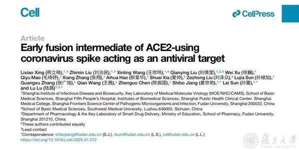 1月30日,基础医学院陆路研究员、孙蕾研究员、姜世勃教授团队合作在《细胞》(Cell)杂志以Research Article的形式,在线发表了题为“Early fusion intermediate of ACE2-using coronavirus spike acting as antiviral target”的研究论文。